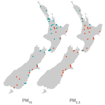 The highest PM2.5 annual average concentrations were observed in towns such as Tokoroa, Pūtāruru, Kaiapoi, and Timaru, where winter woodsmoke from home heating is trapped by local topography and weather conditions.