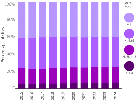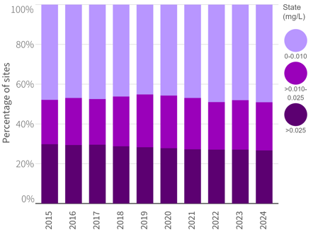 Figure 2. Changes in the state of dissolved reactive phosphorus concentrations from 2015-2024 in groundwater from the 731 wells where there were enough data to determine a result each year. The location of these monitoring sites and the current state result (2024) is shown on the map.