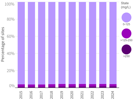 Figure 5. Changes in the state of electrical conductivity from 2015-2024 in groundwater from the 790 wells where there were enough data to determine a result each year. The location of these monitoring sites and the current state result (2024) is shown on the map.