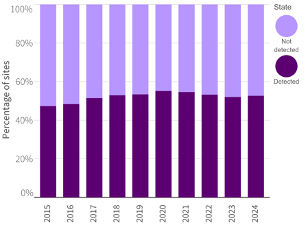 Figure 3. Changes in the state of E. coli detections from 2015-2024 in groundwater from the 573 wells where there were enough data to determine a result each year. The location of these monitoring sites and current state result (2024) is shown on the map.