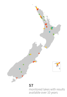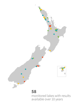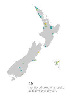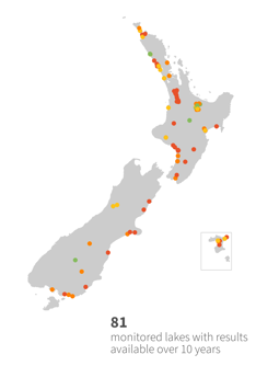 This summary only includes lakes with long-term, high-quality data that meets monitoring standards. Many of the lakes with the best data are in areas where human activity has had a noticeable impact, or where social and cultural values have motivated regular sampling. As such, the results are not a national representation of all lakes in New Zealand. That said, we can learn a lot from the monitoring histories of the lakes that are regularly monitored.