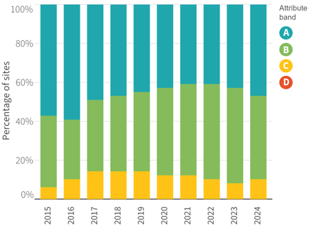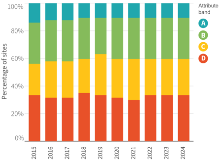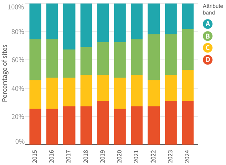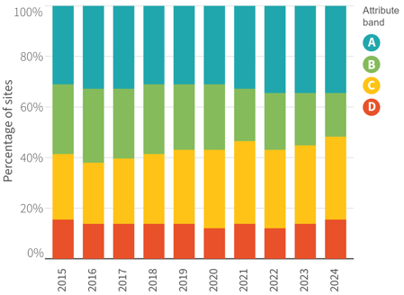 To understand long-term changes for these indicators, we analysed sites with a near-complete sampling record over the last 15 years. This enabled us to calculate state attribute bands for each five-year interval over the last decade (2015-2024). For example, results for 2015 are based on data collected over five hydrological years from July 2010–June 2015. This allows us to compare how the same set of lake sites have changed over time.