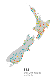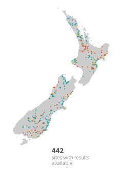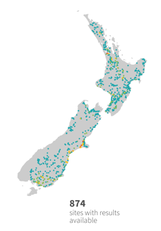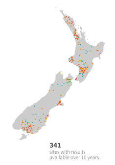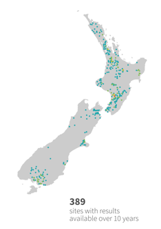 Not all rivers across New Zealand are monitored, and monitored sites are often in areas more at risk from human activities. This means the summary results are not necessarily a balanced representation of all rivers and streams across the country. That said, we can learn a lot from the monitoring histories of the 1700 river and stream sites that are regularly sampled.