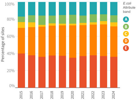 Sites with poorer E. coli scores (D and E bands) are typically in lowland catchments with heavily modified catchments.