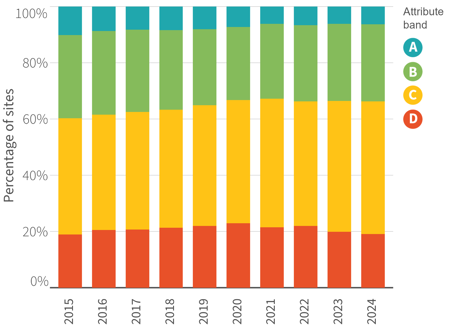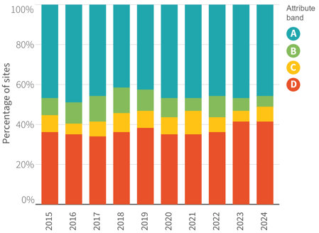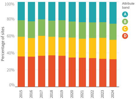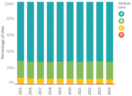 Over the past 10 years, the proportion of sites in each band has remained relatively stable (Figure 4).