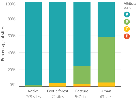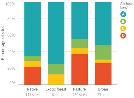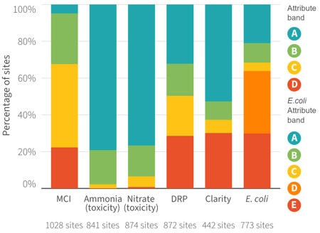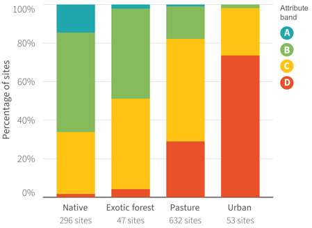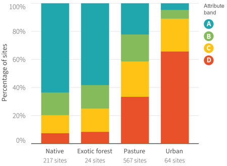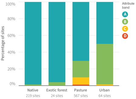 Sites graded in the A band are typically higher-elevation areas with more natural land cover. D band sites are typically in lowland, heavily modified catchments.