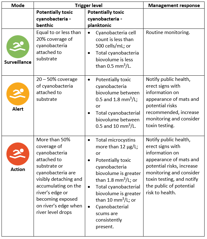 Results are compared to national guidelines for toxic algae (New Zealand Guidelines for Cyanobacteria in Recreational Fresh Waters: interim guidelines*), which provide trigger levels that allow councils to assess individual monitoring results and determine when management intervention is needed. The trigger levels and corresponding management responses are shown in the table below.