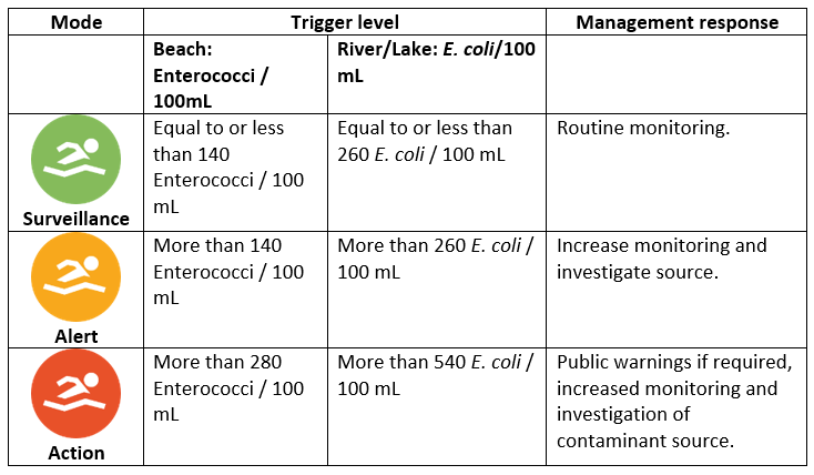 When water quality falls in the ‘surveillance’ category, it indicates a low risk of illness from swimming. If water quality moves into the ‘alert’ category, it indicates an increased risk of illness from swimming, though still within an acceptable range. However, if water quality reaches the ‘action’ category, it poses an unacceptable health risk from swimming.