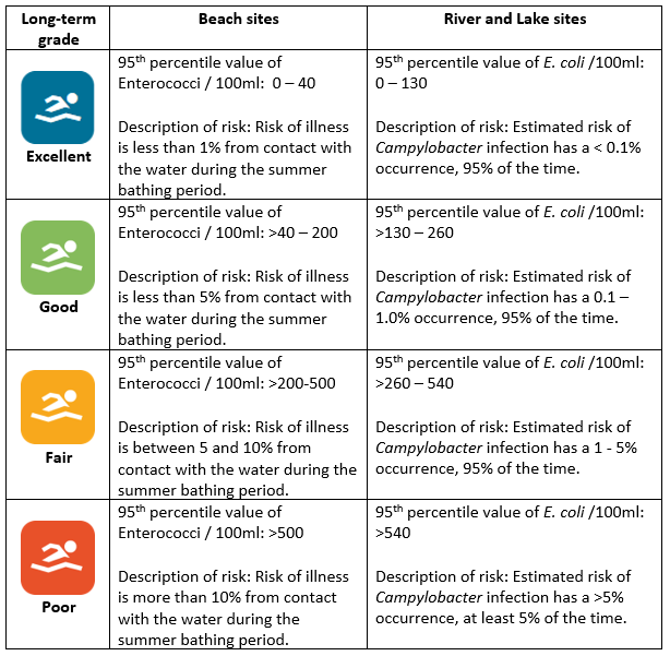 The long-term grade is a precautionary guide to general water quality, assessing whether a site is excellent, good, fair or poor for swimming during the recreational bathing season. Updated annually, it is calculated from faecal indicator bacteria data (E. coli for freshwater or enterococci for coastal waters). This overall grade is risk-based and may not reflect conditions on a particular day.