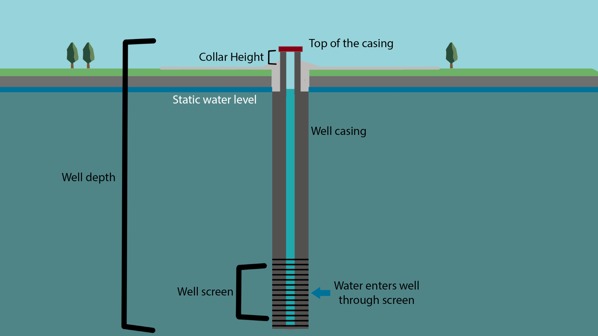 This refers to the diameter of the well casing, expressed in millimetres. Modern drilled wells may have diameters ranging from 50 mm to 300 mm. Wells with PVC casing usually have diameters of 50 mm to 100 mm. Older dug wells may have diameters up to 1000 mm or more.